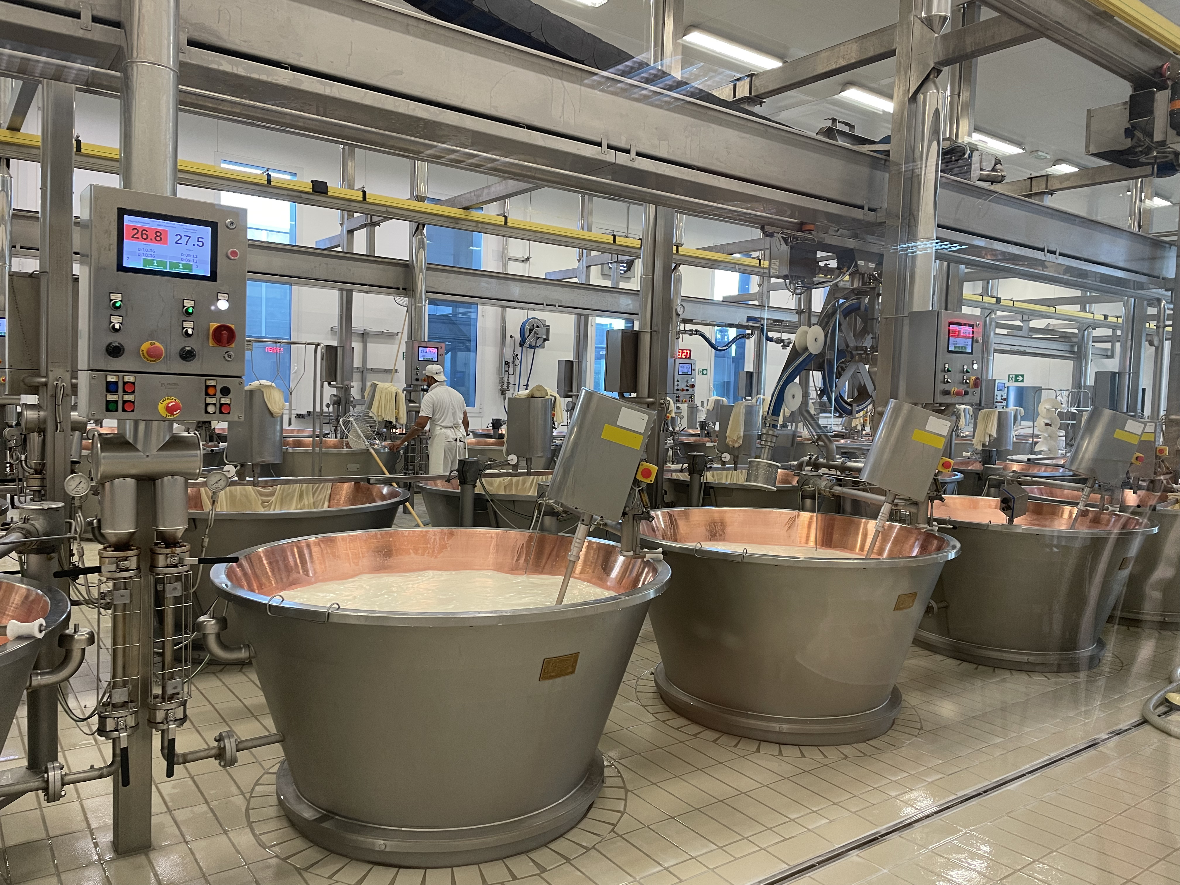 Okay, let’s talk cheese. Our first stop was one of the Parmigiano Reggiano factories, 4 Madonne Caseificio Dell’ Emilia. Immediately I was surprised by the look of the facility. When I hear factory I think big, lots of smoke, and ugly, but this building, though large, was clean and very well kept. We were going to be taken on a tour of the facility and the tour started by learning about the basics. As someone who has taken a Spanish wine class there were a lot of similarities between standards. Like wine, cheese has a denomination of origin, meaning the cheese can only be produced in certain areas of Italy. There are 5 locations, all owned by the same company, where production occurs all around the same area within the Emilia Romagna region. There is a specific cow the cheese must come from and the cow’s diet and care is very strict to ensure the cheese is up to standards. The cheese is 100% natural so it is very important that the origin of the cheese (the cow) has a natural diet as well.