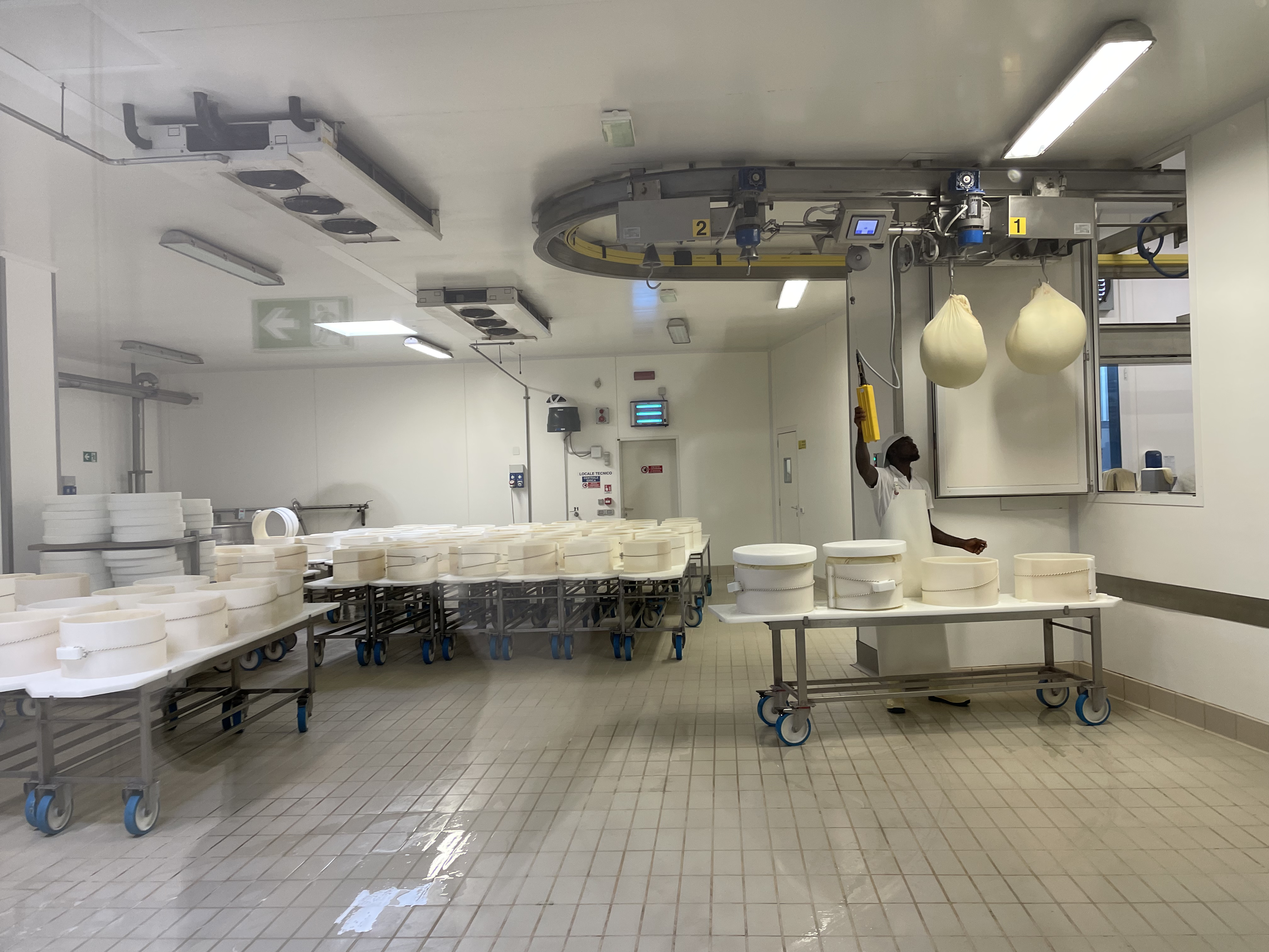 The first room we walked into is the room where they make the cheese in these giant metal bowls. The cows are not located at the production facility, but instead are locally owned by the members of the co-op. These members are in charge of milking their cows twice a day, morning and evening, and then delivering it to the cheese production facility. The milk from both morning and evening is then mixed to make the cheese. 500 liters of milk are required for just 1 wheel of cheese. The process of making the cheese is then as follows: the milk is boiled while constantly being stirred, curds then form and fall to the bottom to be collected later. A couple cool things involved in this is that there is a cheese expert at the facility at all times. They are the only ones who can approve during the boiling process before packaging occurs. They wear a special colored hat so that they are known. Once approved, the cheese is brought up to the surface to be wrapped in a cheesecloth and hung up to be brought into the packaging room. Watching this happen was crazy because each big blob of cheese had to be lifted to a degree and they weigh 40 pounds each. Each blob is then split in two and hung on these arms to be brought into the next room by an automatic system built into the ceiling.
