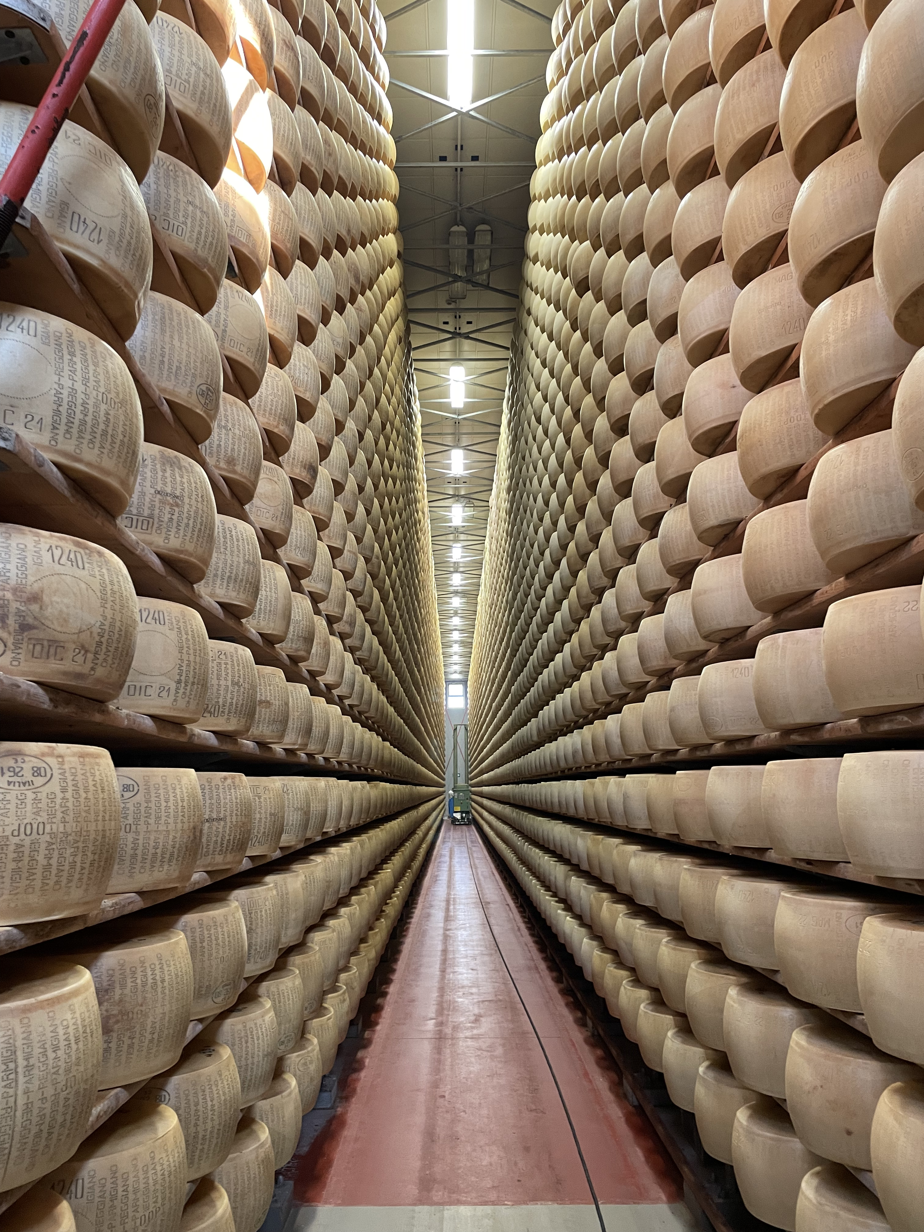 The post production process is equally as interesting. The blobs of cheese are wrapped in linen and stuffed into circular containers to set for 24 hours before being taken out and wrapped in a plastic case that imprints marking onto the wheel. This is crucial because the marking must be present for the wheel of cheese to be designated Parmigiano Reggiano. It imprints “Parmigiano Reggiano” all around the wheel, the date, the certification number, and other standardized information. Then after a couple of days the cheese wheels take a bath…a salt bath. They must be flipped and stay in there for a couple of days. After that they are cooled for a day before going into the big storage room. This was my favorite part of the tour and although I tried to capture it in pictures, it’s crazier than it looks. Imagine a giant warehouse with over 50,000 wheels of cheese. 50,000 WHEELS OF CHEESE. That is millions of dollars in cheese. I couldn’t stop looking at them all in awe. Anyway, the cheese ages for an entire year in there before it can be sold. No earlier, but can be sold a couple years later as well. Also, get this, each wheel has to be flipped every 5 days so it sets evenly. This isn’t done manually, but by a large machine. But that many wheels flipped every 5 days?! That machine practically runs nonstop. Lastly before it’s sold, an inspector must come in and check each wheel of cheese. They do this through an auditory test. The inspector uses a small hammer looking tool and taps around the cheese while listening to the sound it makes. Based solely on that, an expert can tell whether the cheese is good, or up to standards to be sold. Those that are not are sold as a second tier cheese of sorts and have their markings removed.